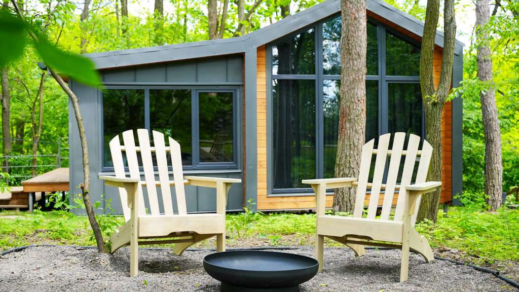 - mini cabins in the forest (1–2 guests, up to 15 sq.m) with panoramic windows and kitchenette, plus a private BBQ area